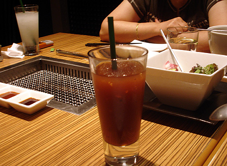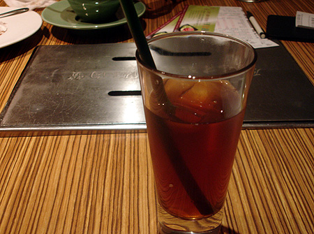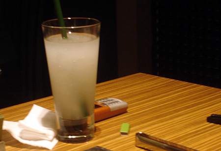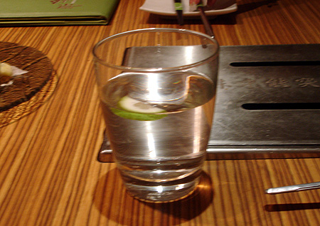 桌上的水 裡頭有檸檬片可以解肉的油膩