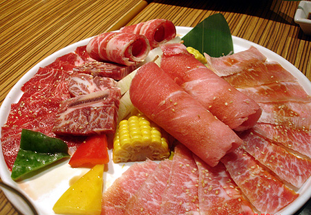 肉盤來了 左半邊是牛肉 右半邊是豬肉